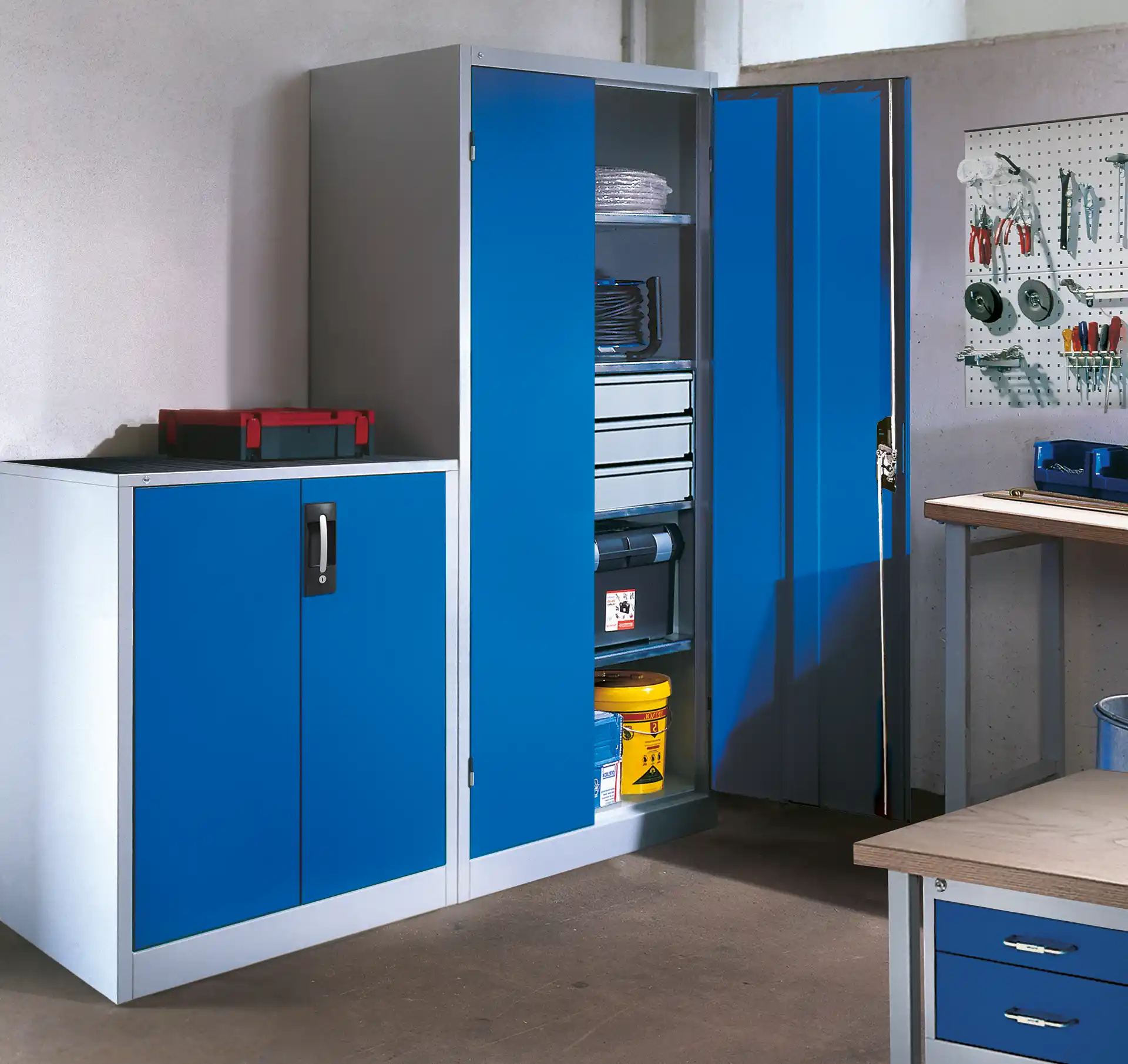 - Armoires d’appoint avec portes battantes : avec ou sans vitres transparentes, ces multi-talents vous permettent de ranger matériaux et outils de manière optimale. Leurs serrures à poignée avec technologie Ergo-Lock brevetée vous facilitent l’accès.