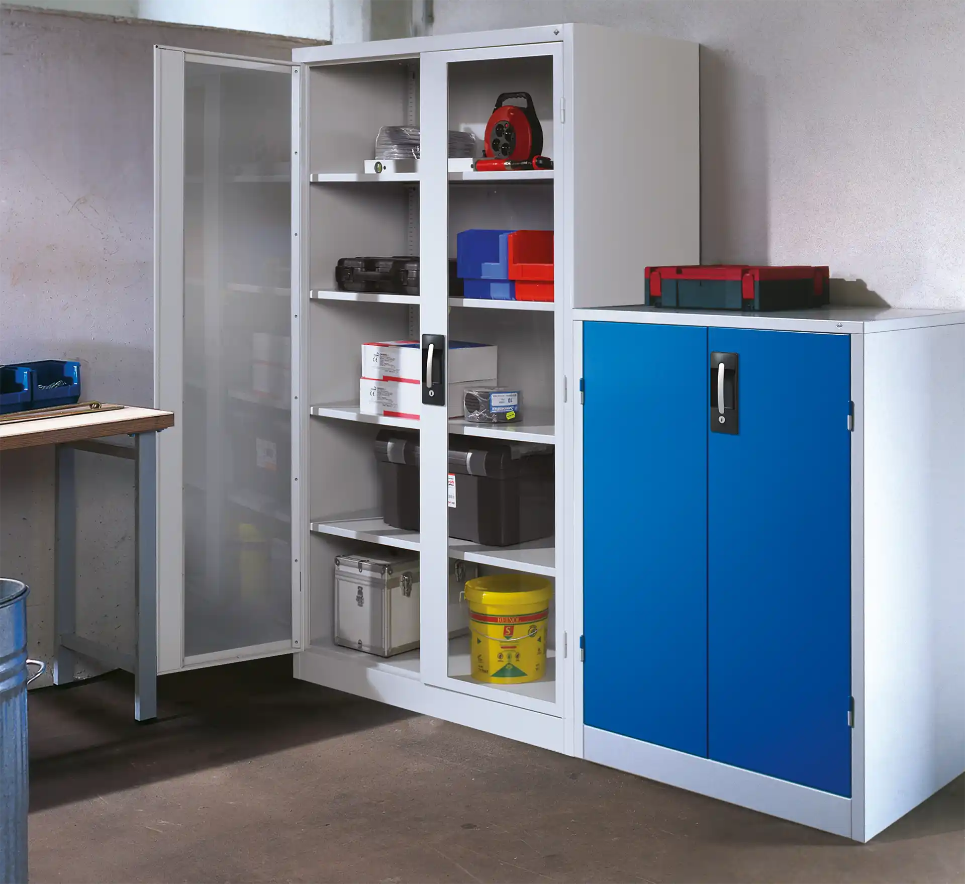 - Armoires d’appoint à portes coulissantes et vitres transparentes : cette variante séduit par ses portes en acier dotées de vitres transparentes en verre acrylique de trois millimètres d’épaisseur. Obtenez ainsi un aperçu direct et gagnez du temps à long terme.