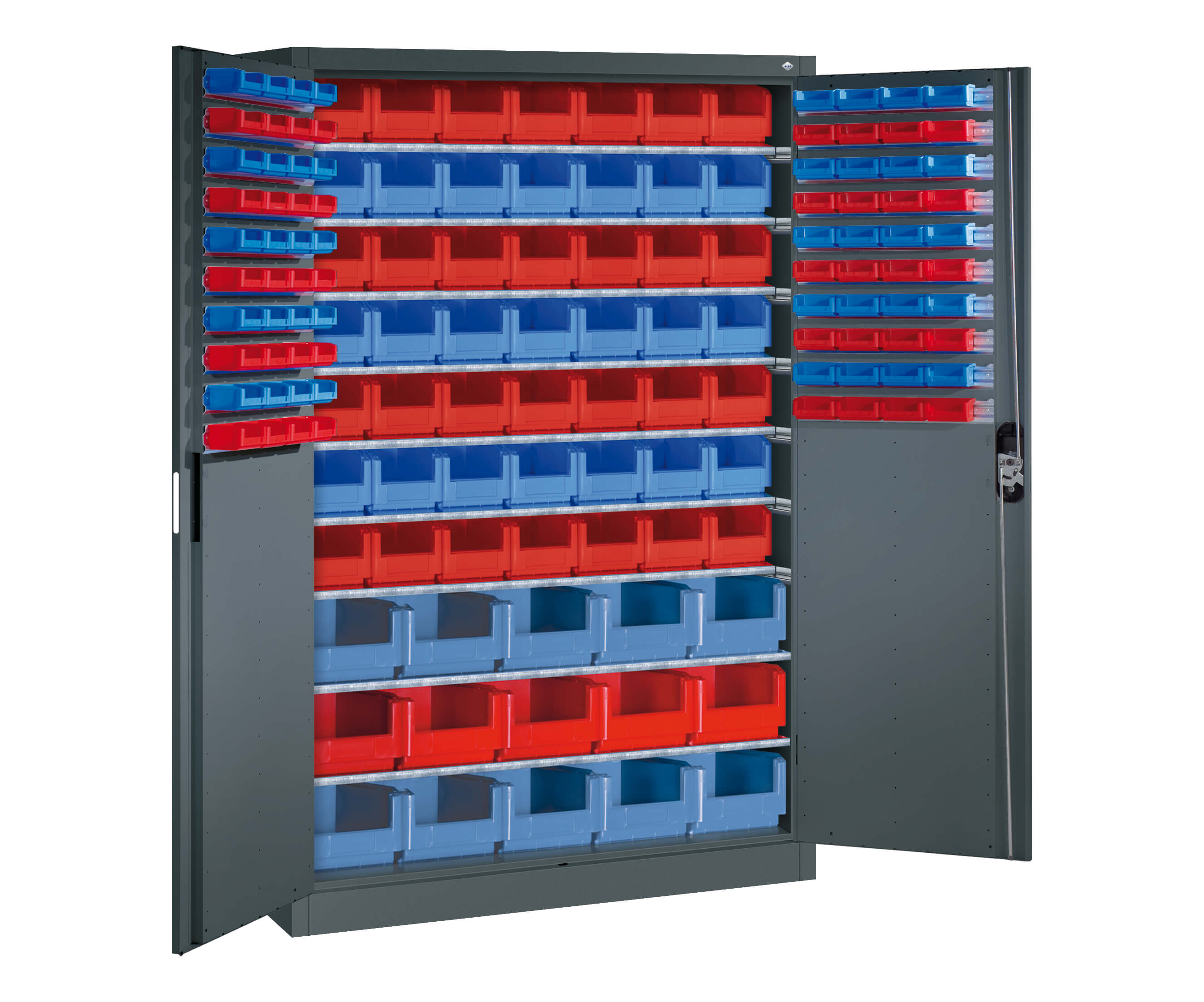 Armoire à outils Acurado, 144 Bacs à bec, 40 pièces de chaque taille 1 rouge/bleu, 21 pièces de taille 3 bleu, 28 pièces de taille 3 rouge, 10 pièces de taille 4 bleu, 5 pièces de taille 4 rouge, portes avec rails de suspension pour bacs à bec, profilés latéraux fermés et barres de fermeture dissimulées pour une stabilité et une protection contre les effractions maximales, avec butée Soft, suspension de porte dans des charnières extérieures avec un angle d'ouverture généreux d'environ 180 degrés, 7 tablettes en acier galvanisé, raccourcies, charge admissible 70 Kg, 3 tablettes en acier galvanisé avec grande capacité de charge de 70 kg, 1 serrures à poignée Ergo-Lock pour une sécurité d'utilisation et une résistance à l'usure optimales, serrure à cylindre avec fermeture 3 points, avec serrure à cylindre et 2 Clés, dimensions (H x L x P): 1950 x 1200 x 500 mm, Couleur: RAL 7016 gris anthracite, Portes: RAL 7016 gris anthracite