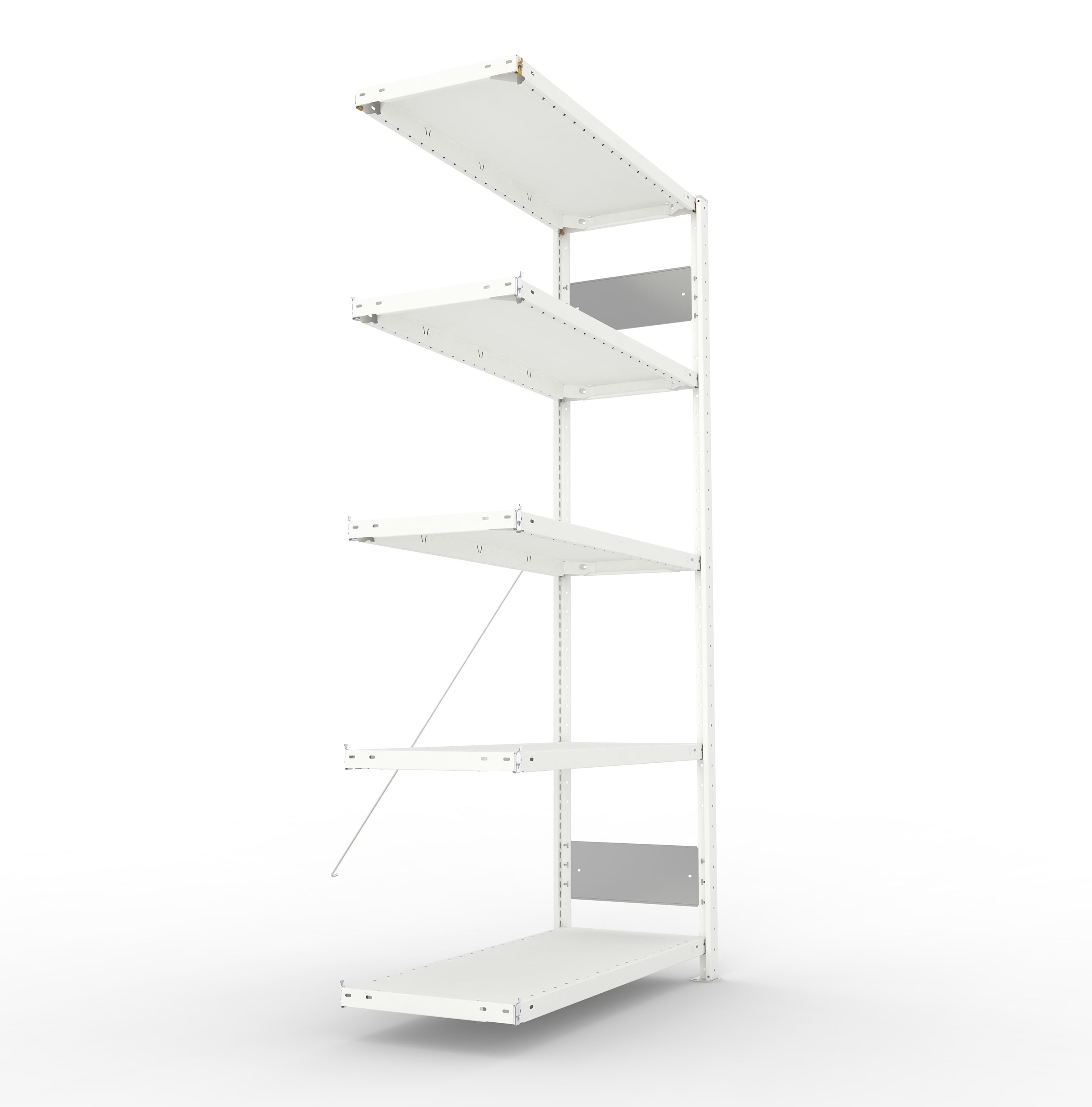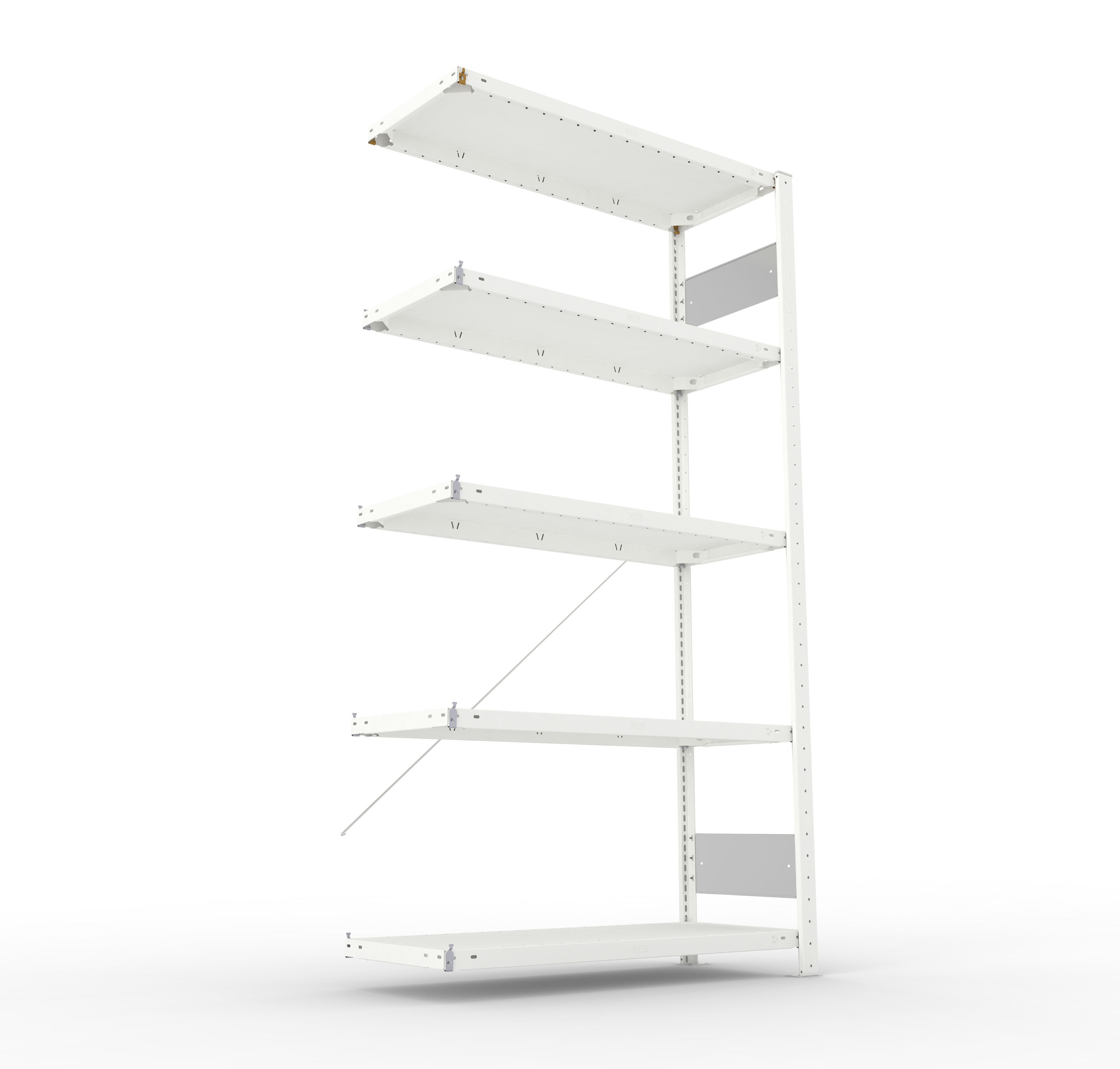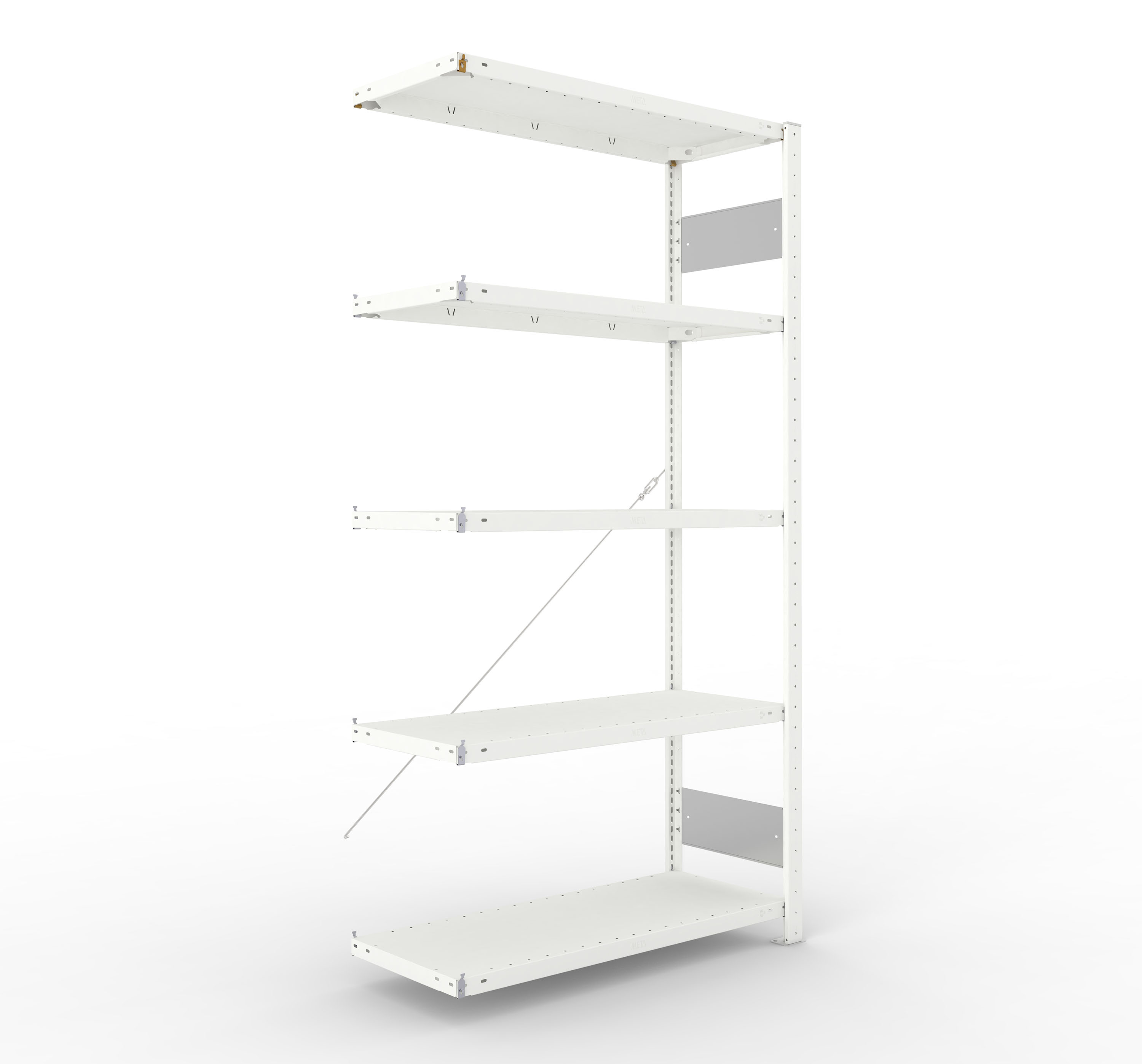 Rayonnage de stockage pour charges lourdes pour charges lourdes Profi, comme étagères d'extension, comprenant : 1 cadre latéral, 1 entretoise diagonale avec tendeur à vis, 4 tablettes avec une grande capacité de charge de 230 Kg, réglables au pas de 50 mm, montage simple par encastrement sans vis, couleur : gris clair RAL 7035, , Dimensions (H x L x P): 2000 x 1006 x 436 mm