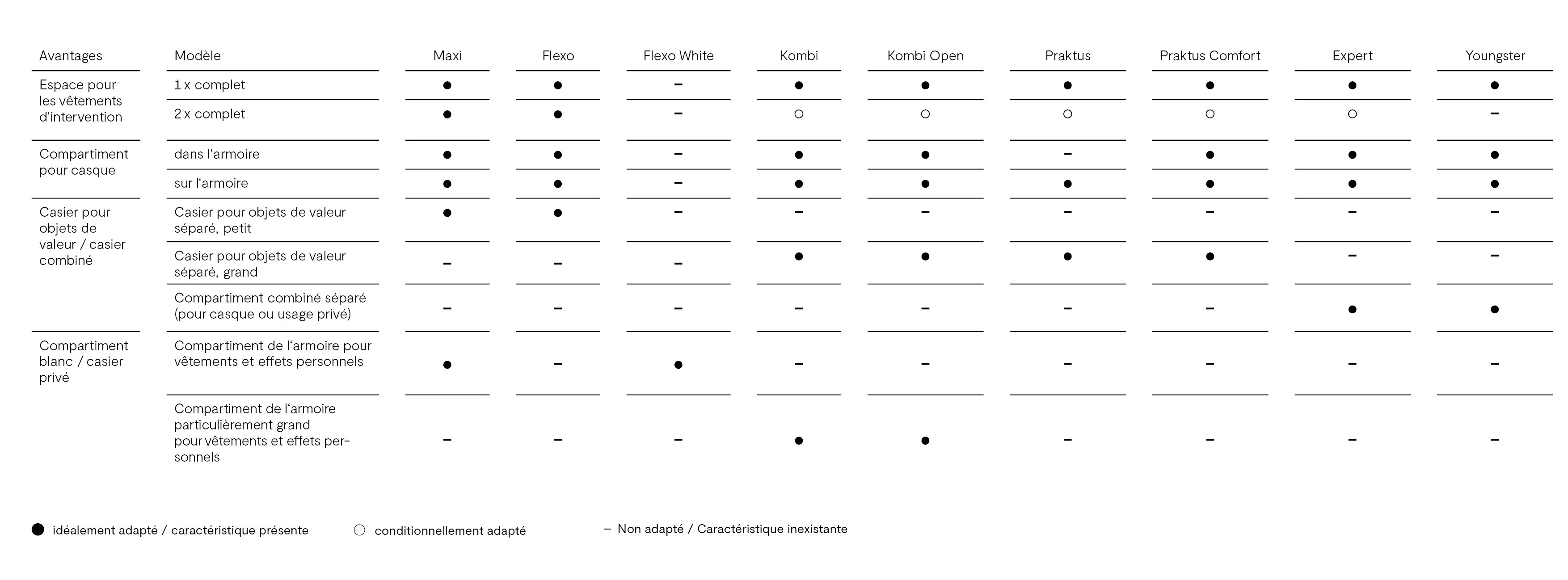 Chez nous, vous avez le choix entre différents vestiaires de pompiers aux aménagements variés. Dans la présentation suivante, vous trouverez un récapitulatif de notre gamme de vestiaires de pompiers. Selon vos besoins, vous avez le choix entre plusieurs modèles : un gain de place considérable, une séparation des compartiments pour les effets personnels ou des compartiments pour objets de valeur séparés destinés au casque, aux affaires de chacun ou même aux deux.